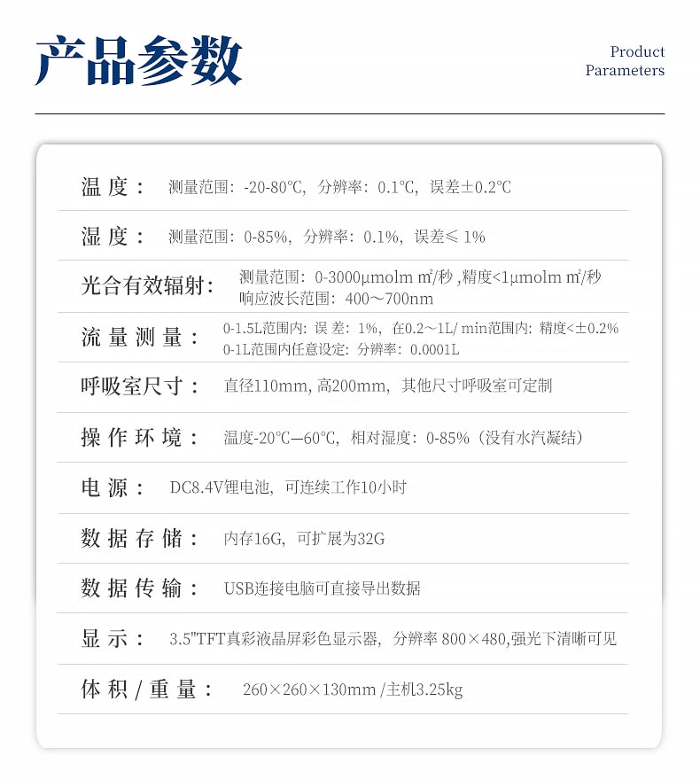 加入了溫度調節的雙波長紅外二氧化碳分析器, 測量范圍:0-5000ppm,分辨率:0.1ppm; 精度3ppm。二氧化碳測量不受溫度變化影響,具有穩定、精度高,反映靈敏,1秒鐘之內就可以完成二氧化碳差值采集。