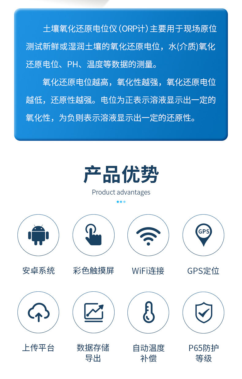 土壤水質氧化還原電位儀(ORP計)主要用于現場原位測試新鮮或濕潤土壤的氧化還原電位,水(介質)氧化還原電位、PH、溫度等數據的測量。符合《HJ746-2015土壤氧化還原電位的測定電位法》標準。