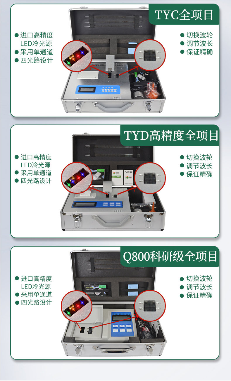 5、采用高亮LED燈光源、雙撥輪濾光式處理技術,保證光源波長穩定, 硅半導體作為信號接收系統, 壽命長達10萬小時級別。光源穩定,重現性好,準確度高。