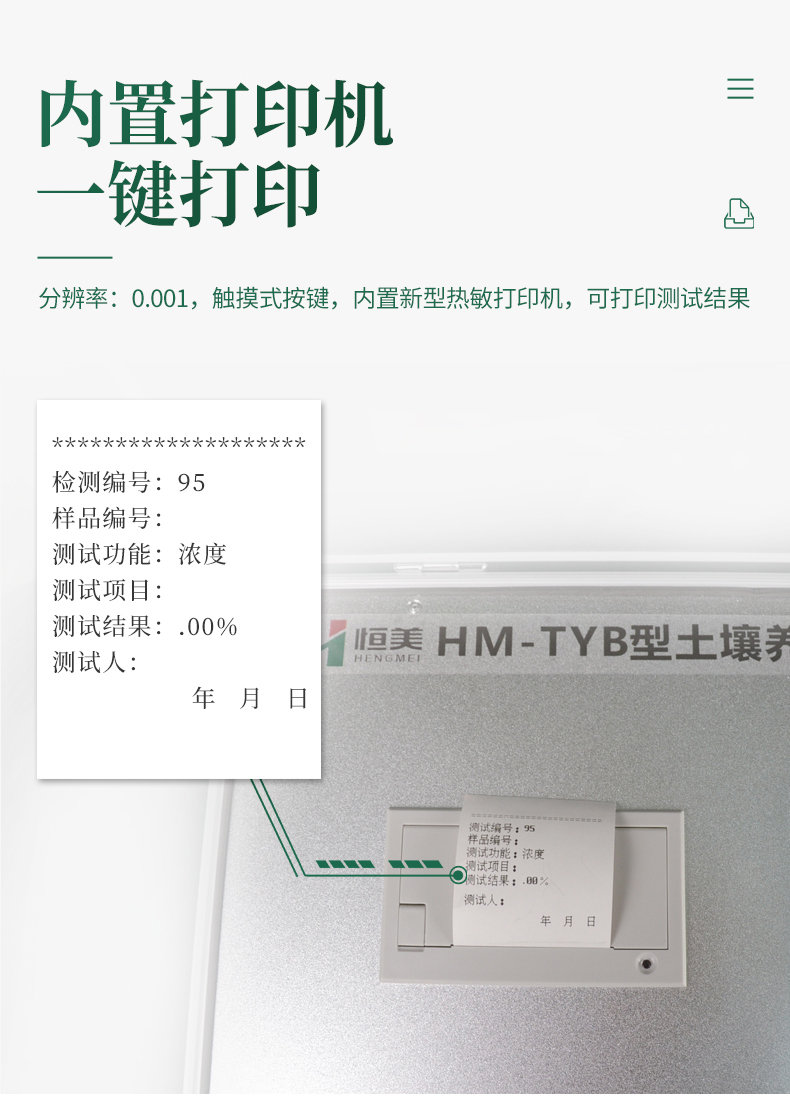 3、分辨率:0.001,觸摸式按鍵,內置高效熱敏打印機,可打印測試結果。